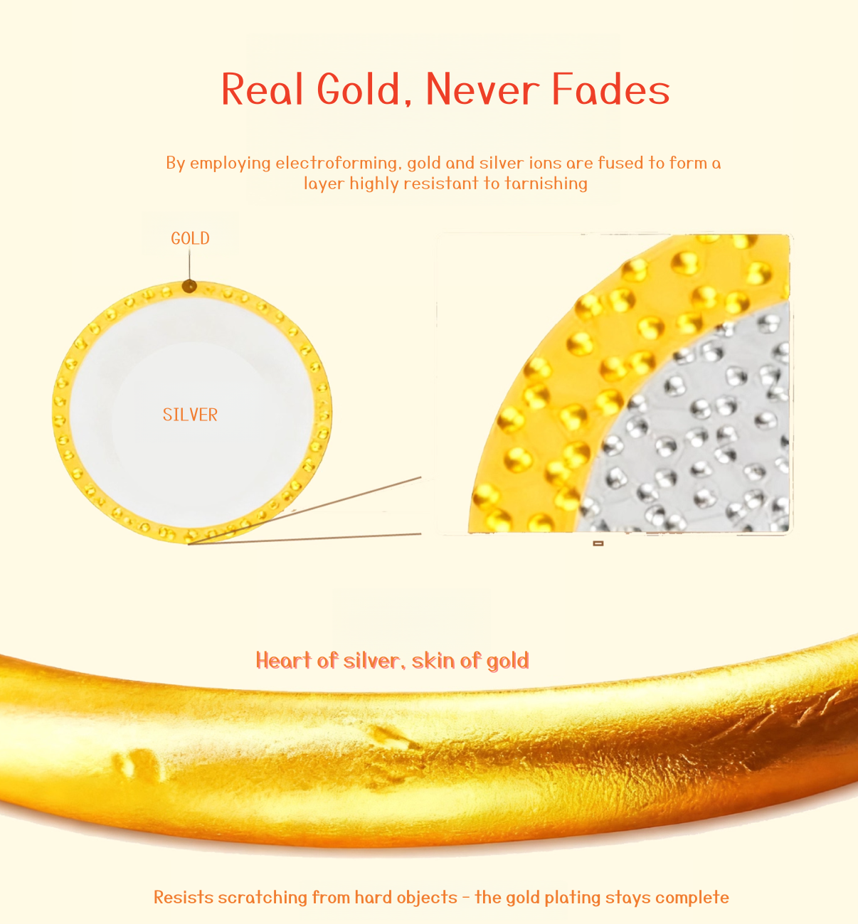Meticulous craftsmanship endows it with a unique texture. With steadfast sterling silver as its foundation, forming the bracelet's skeleton, it is meticulously enveloped in radiant pure gold. The fusion of gold and silver not only creates a striking visual contrast but also symbolizes the perfect harmony between inner resilience and outer elegance. The glow of gold reflects vitality and warmth, while the texture of silver embodies calm and refinement.